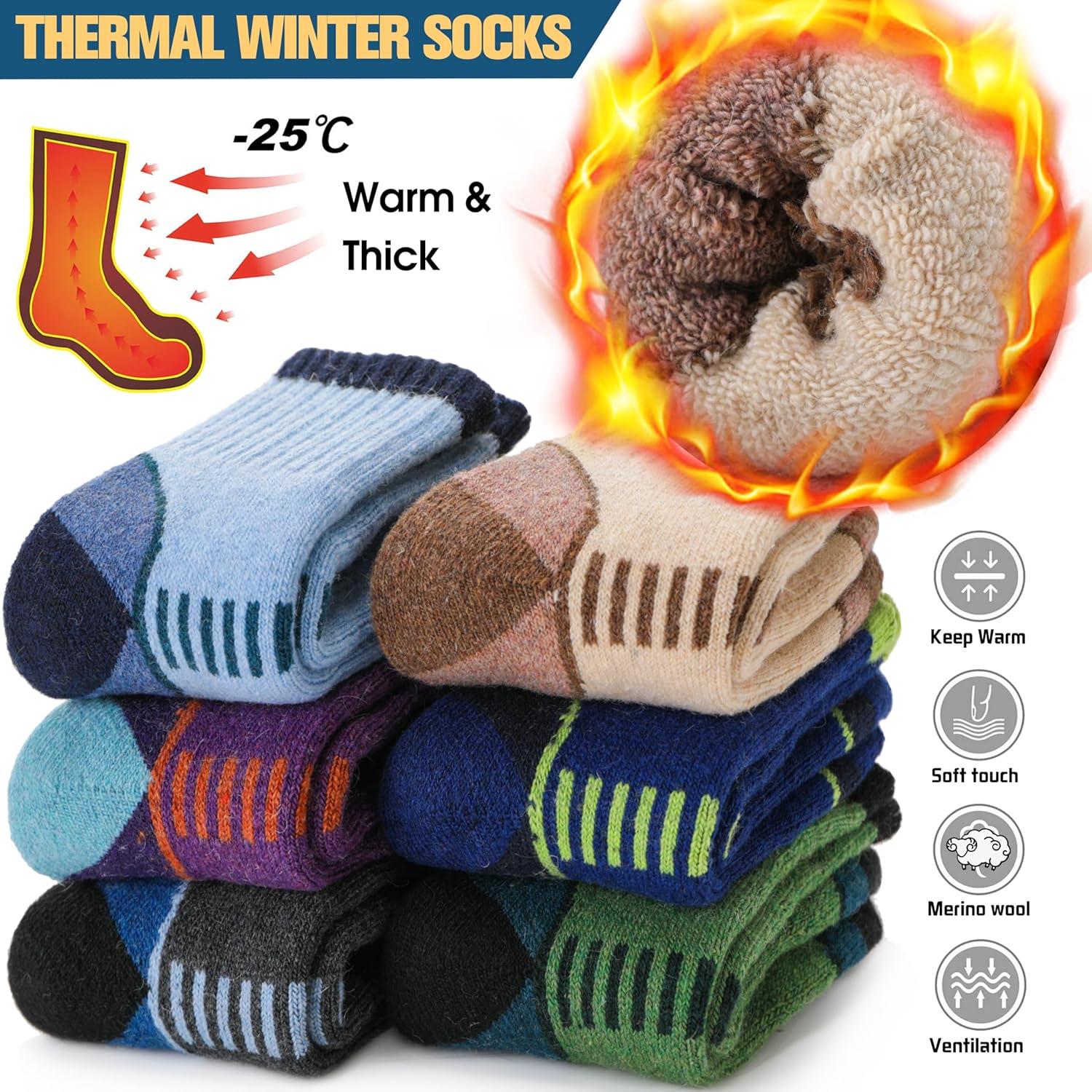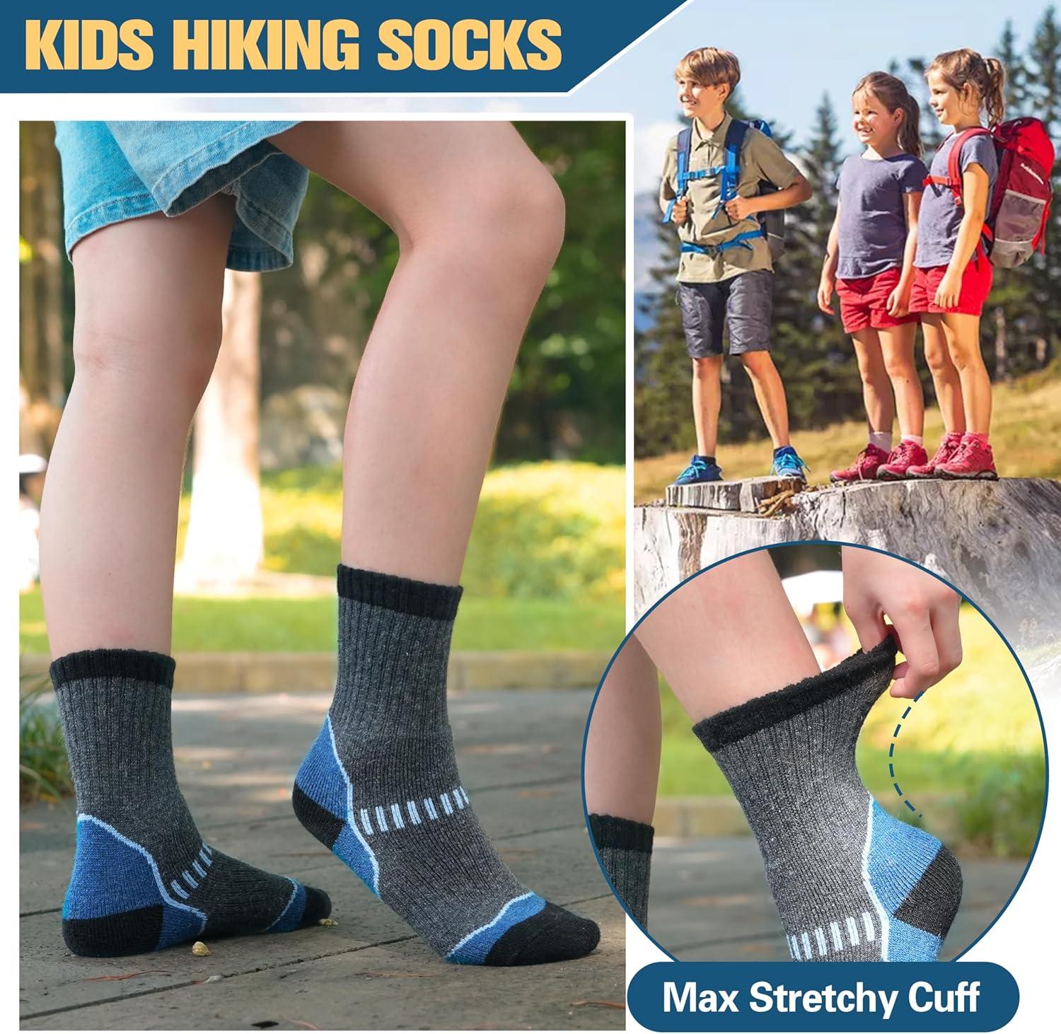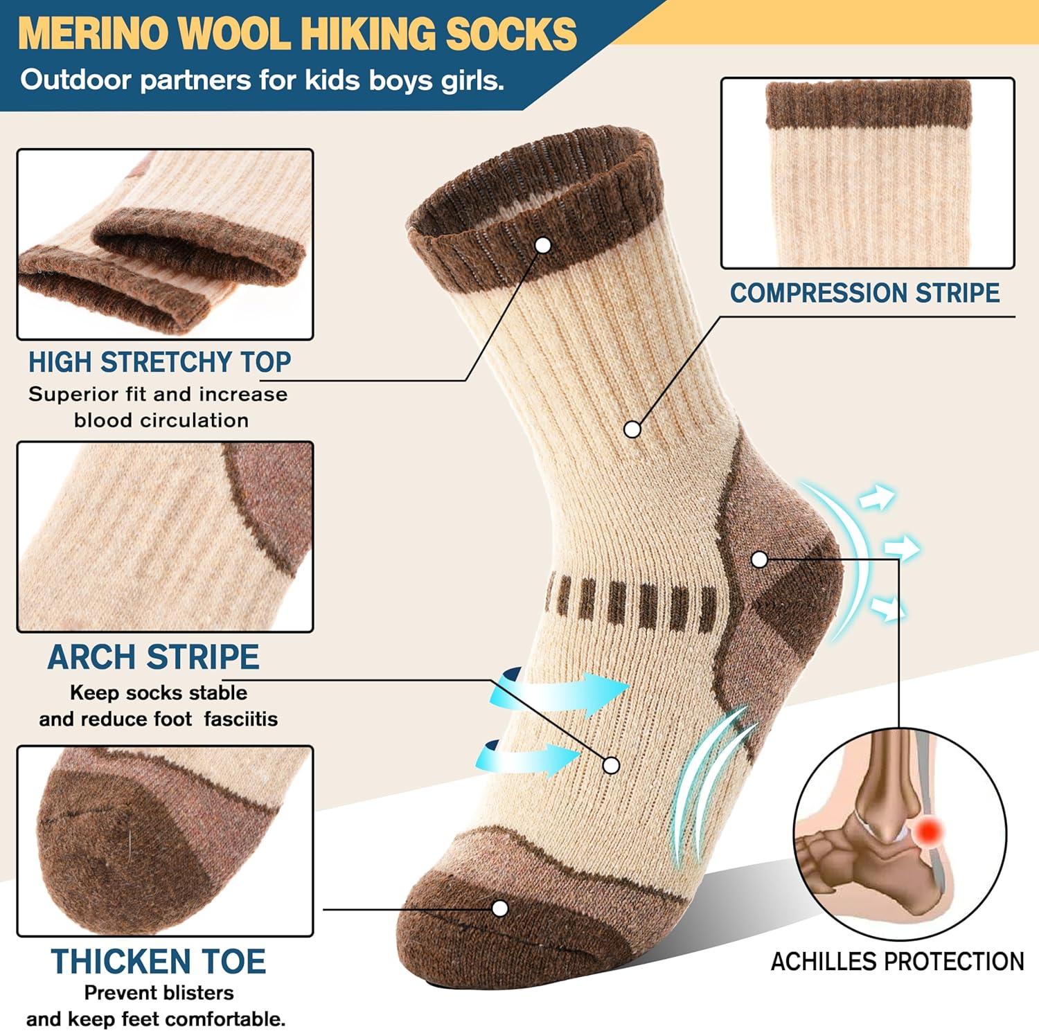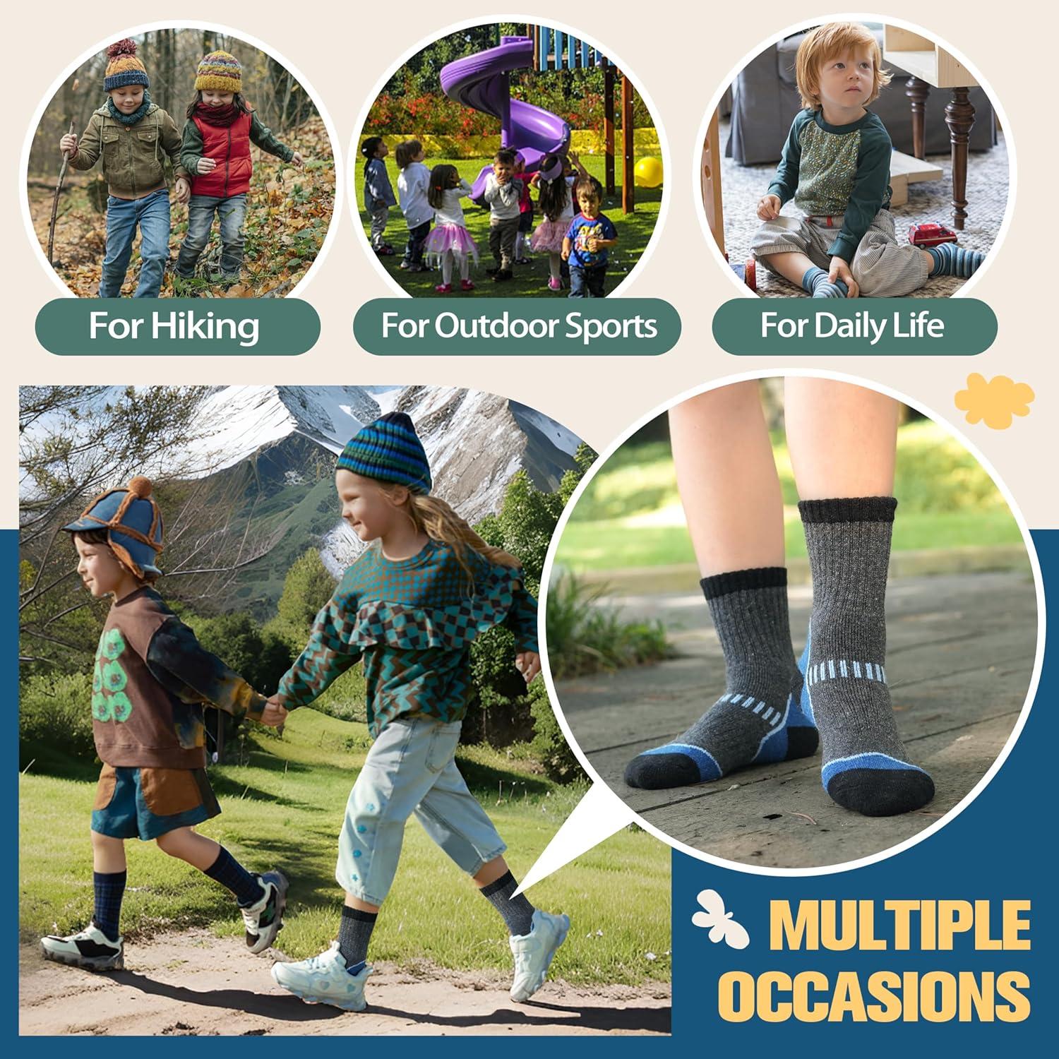 Kids Merino Wool Hiking Socks Boys Girls Toddler Thermal Winter Warm Thick Cushioned Moisture Wicking Socks 6 Pairs(Green/Purple/Grey/Dark Blue/Blue/Beige)
