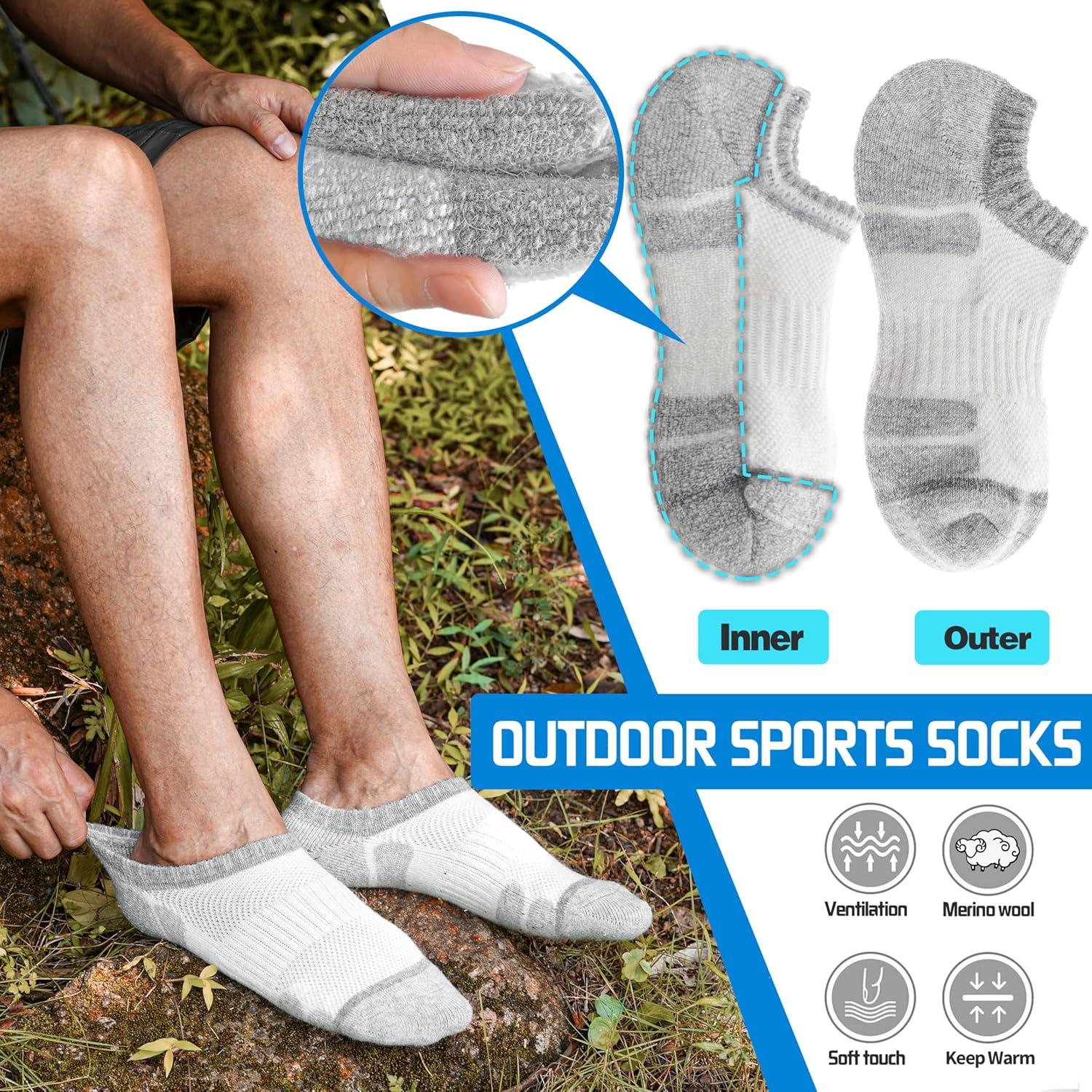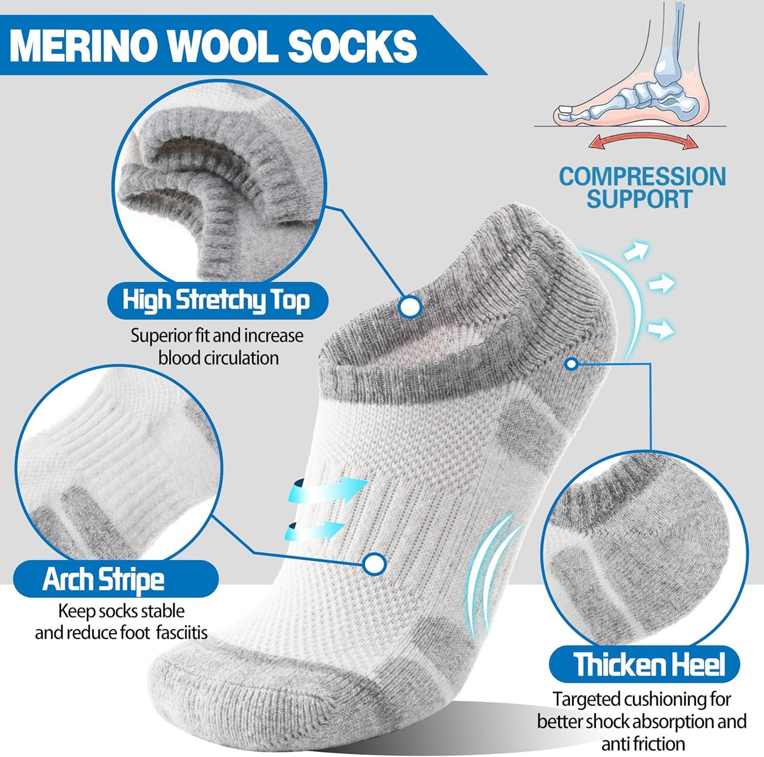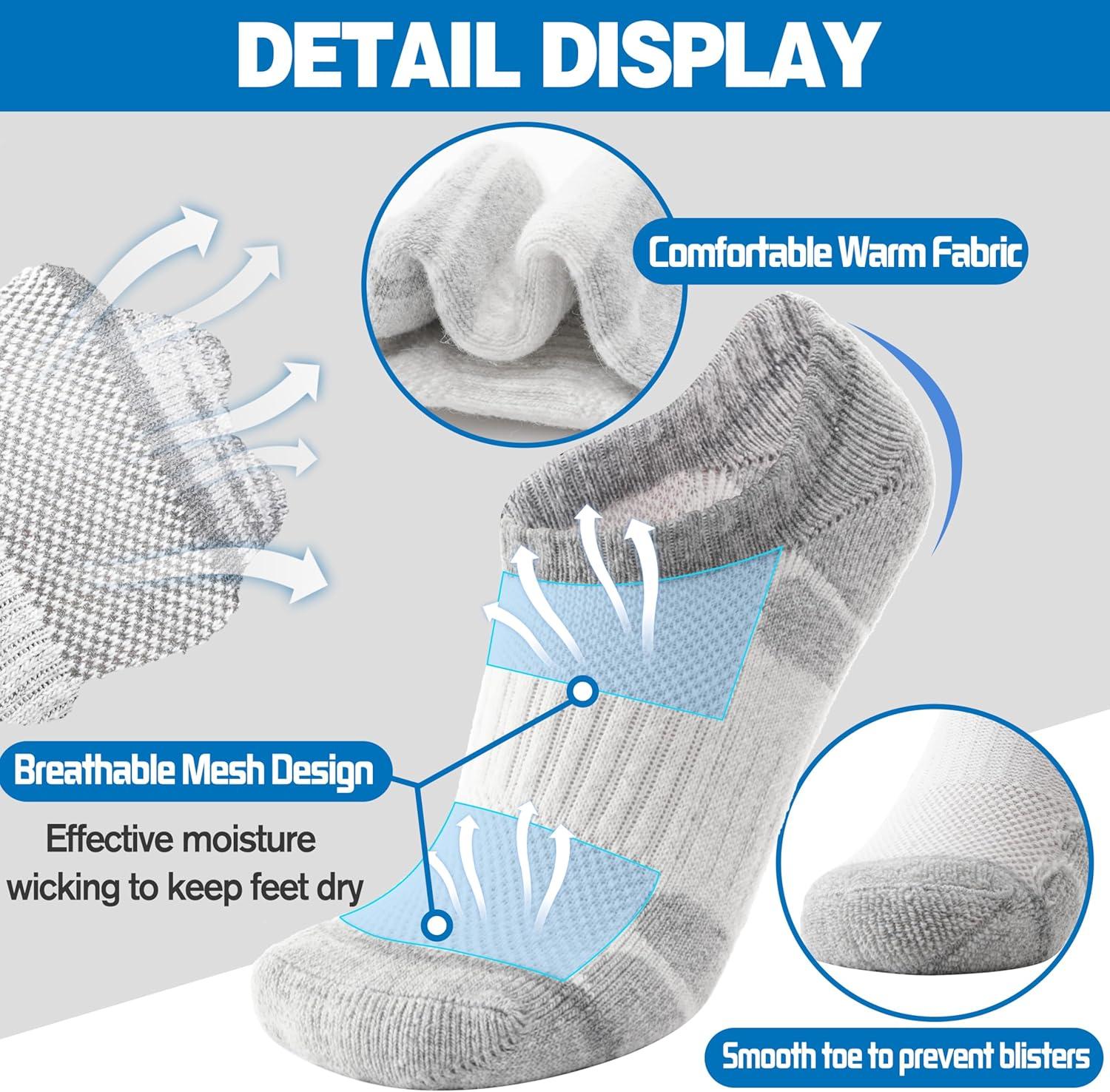 Merino Wool Hiking Running No Show Socks for Women Men Thick Warm Athletic Low Cut Thermal Ankle Socks 6 Pairs(Grey White)