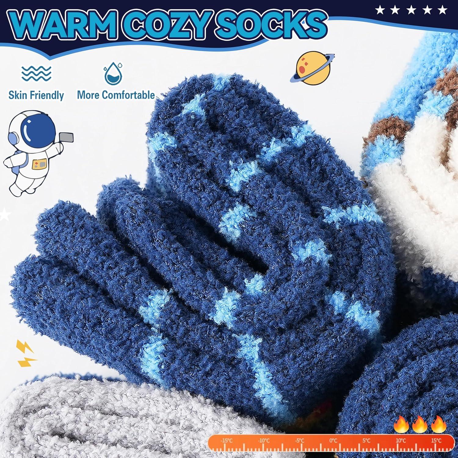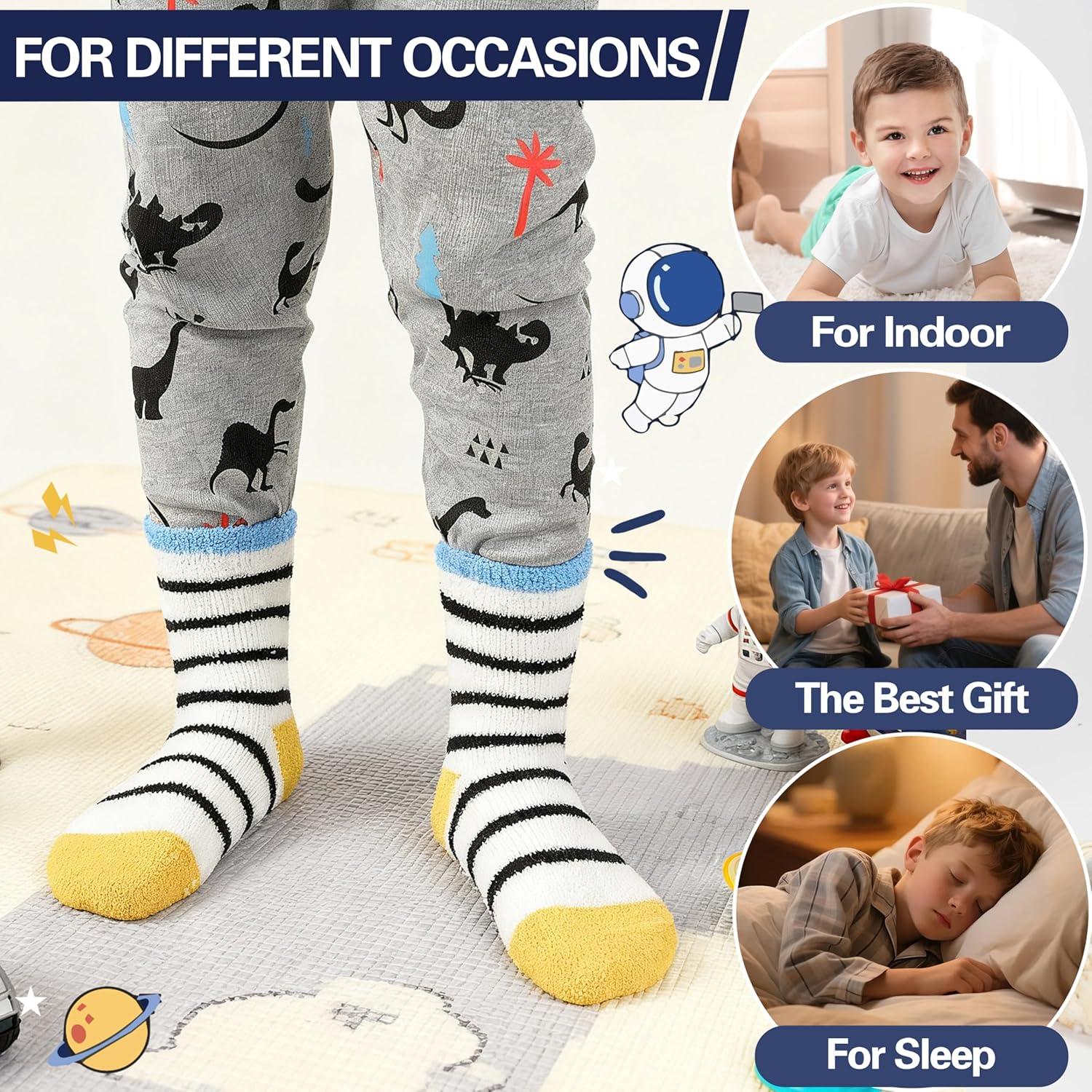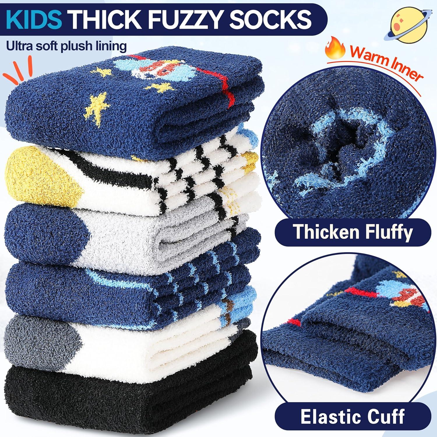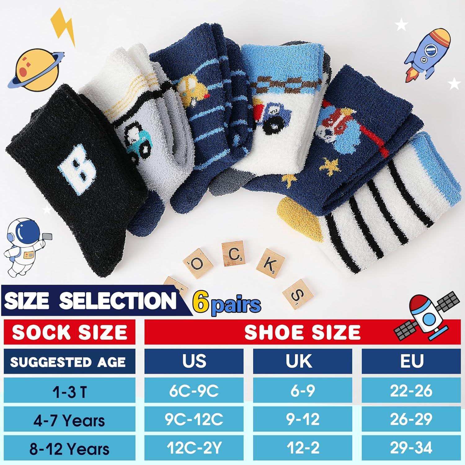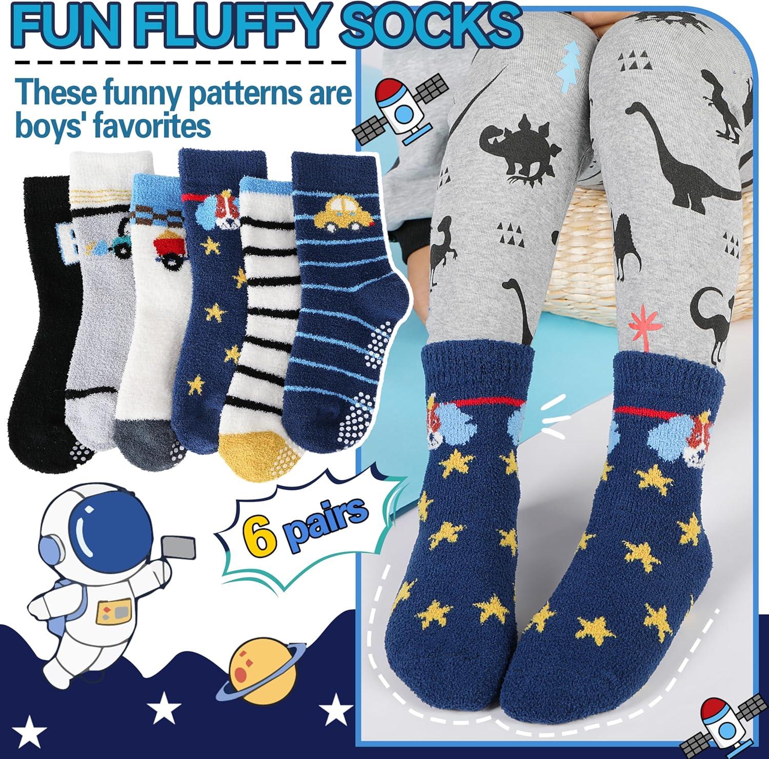 MOGGEI Kids Boys Toddlers Fuzzy Slipper Grips Socks Non Slip Warm Winter Fluffy Cozy Thick Fun Crew Gripper Socks 6 Pairs(Truck)
