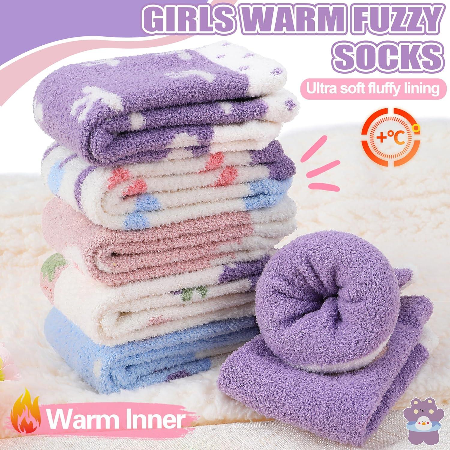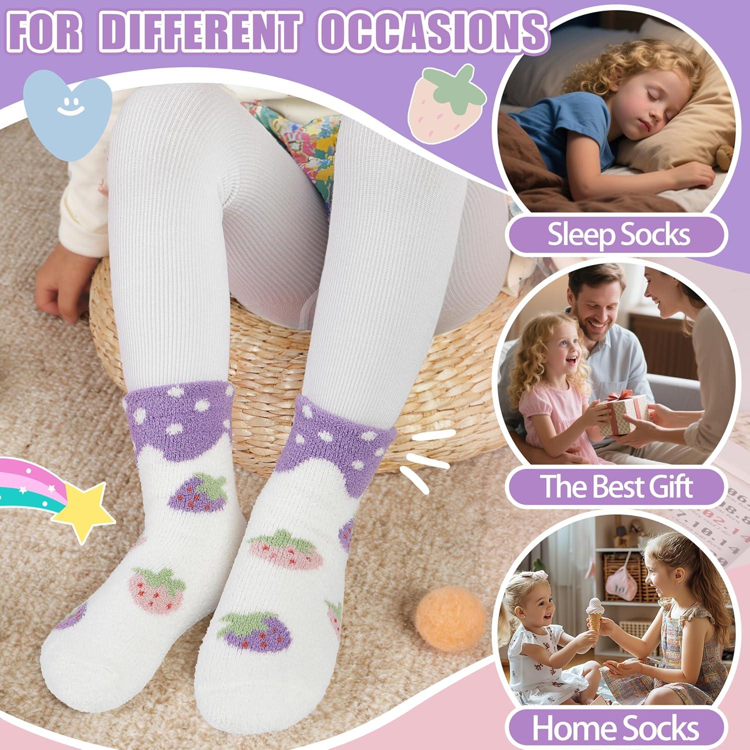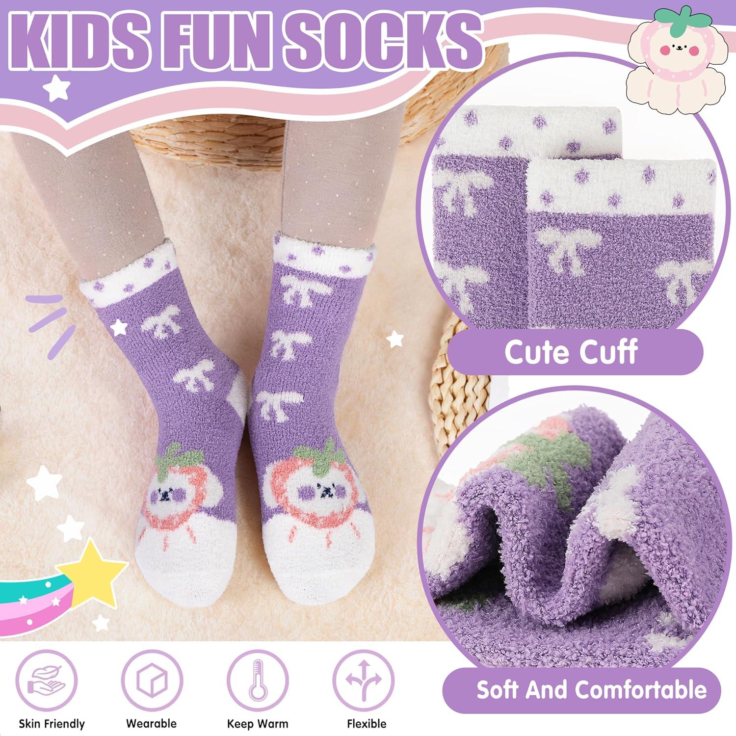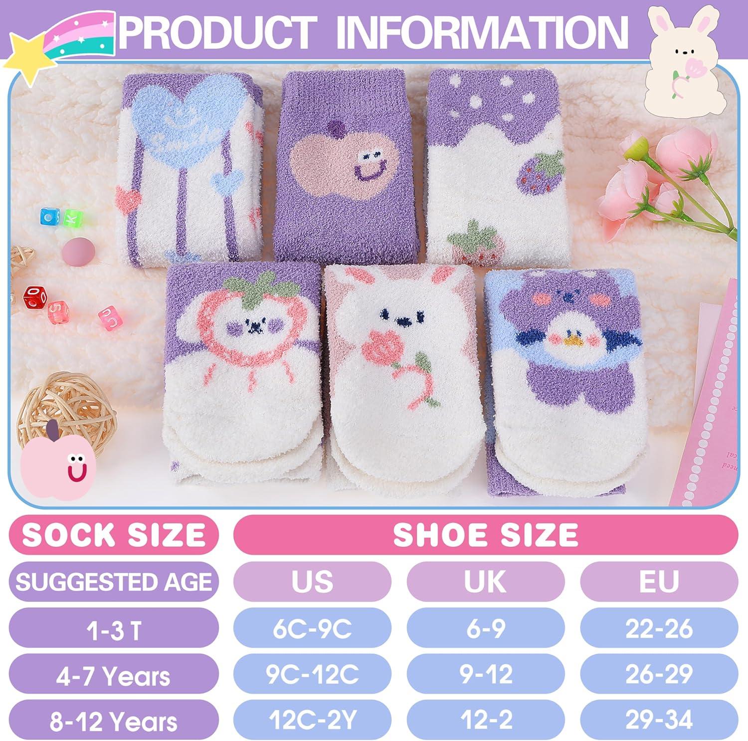 MOGGEI Kids Girls Toddlers Fuzzy Slipper Grips Socks Non Slip Warm Winter Fluffy Cozy Thick Fun Crew Gripper Socks 6 Pairs(Purple Animal)